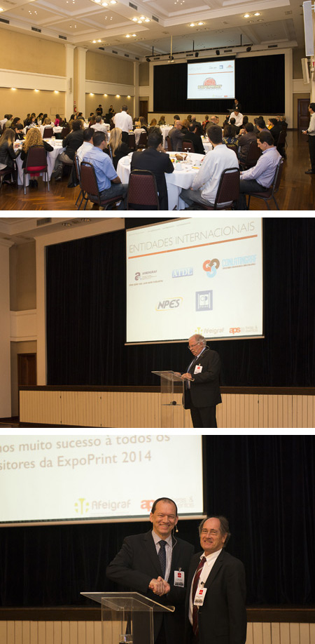 O encontro entre mais de 100 profissionais expositores da ExpoPrint Latin America 2014 teve início com as palavras de Dieter Brandt, presidente da Afeigraf (Associação dos Agentes de Fornecedores de Equipamentos e Insumos para a Indústria Gráfica), realizadora da ExpoPrint. Dieter abordou as ações promovidas pela associação, destacando sua importância ao setor.